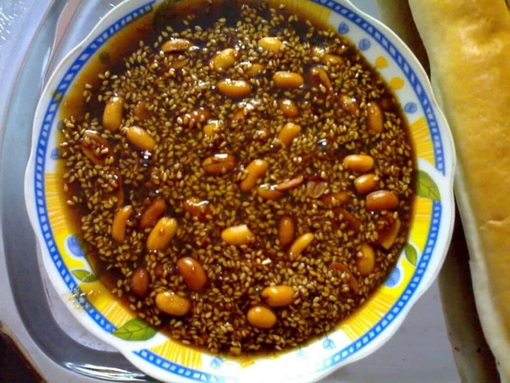 ثم ترفع عن النار ثم نحمص السمسم والفستق في الزيت ثم نضيفهما إلي خليط الحلبة ونقلبهم وتترك لتبرد ثم يعبأ في مرطب .