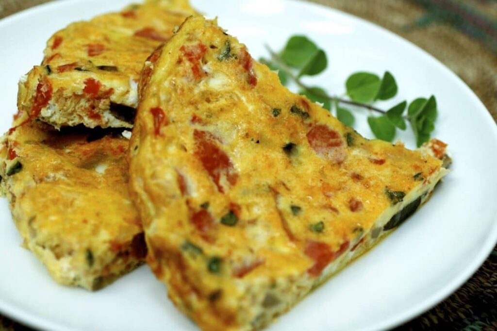 7. ثم قومي بوضع مكونات العجة في الصينية.